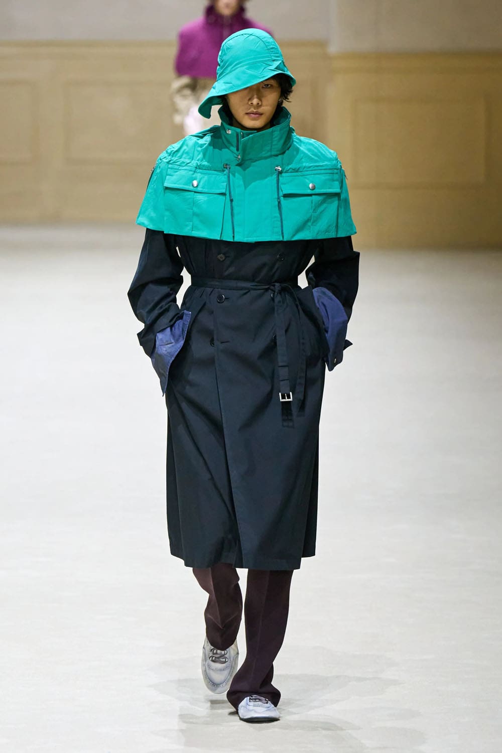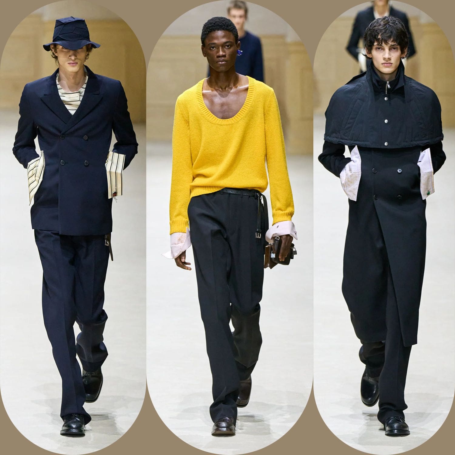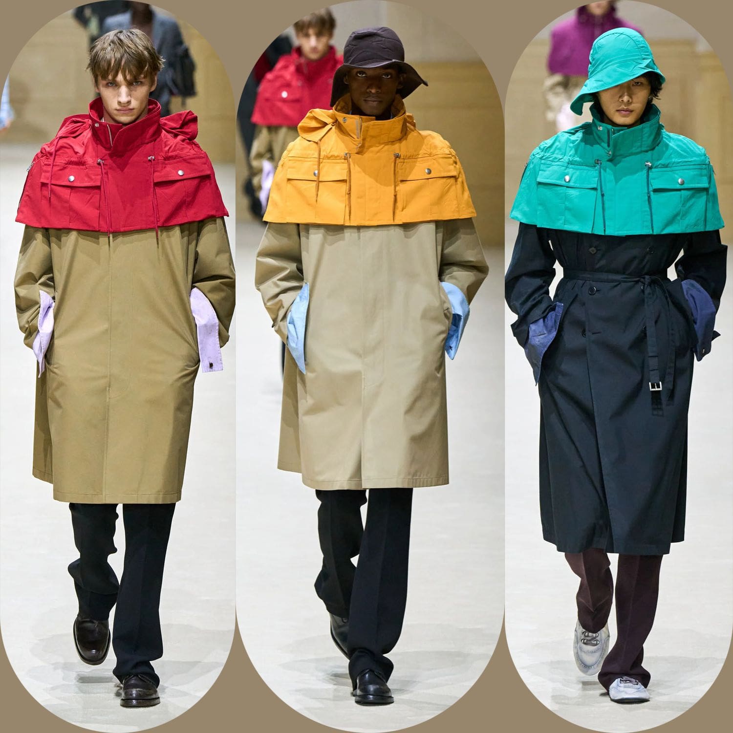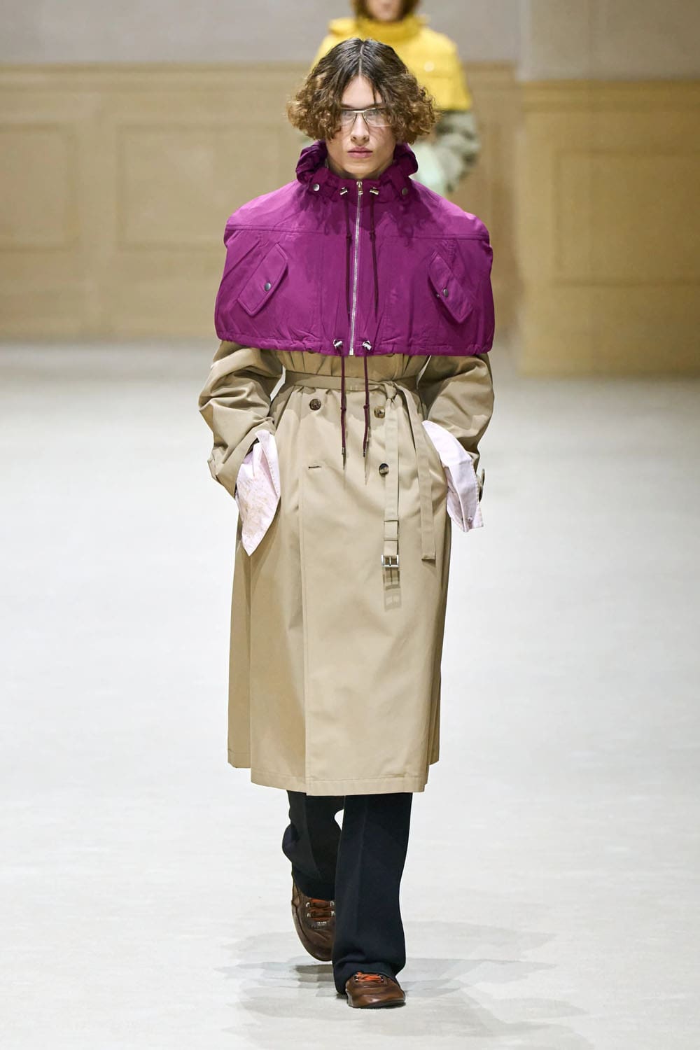Ese motivo de capa se repitió a lo largo del desfile con diversos acentos cromáticos, evolucionando como capítulos. Una gabardina color arena con una capa amarilla solar ofrecía una propuesta más brillante e irónica, mientras que una silueta similar en beige neutro se combinaba con una capa magenta intenso ceñida al cuello: dramática, sí, pero sobria. Los hombros se ensancharon, pero la intención no era volumen. Era memoria. Esta era una silueta que sabía de dónde venía.