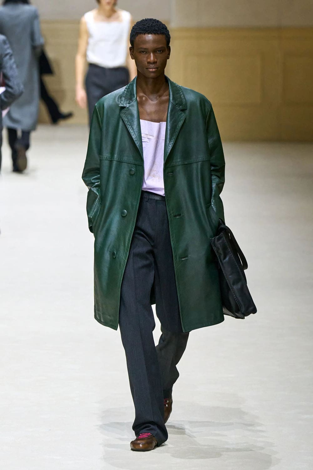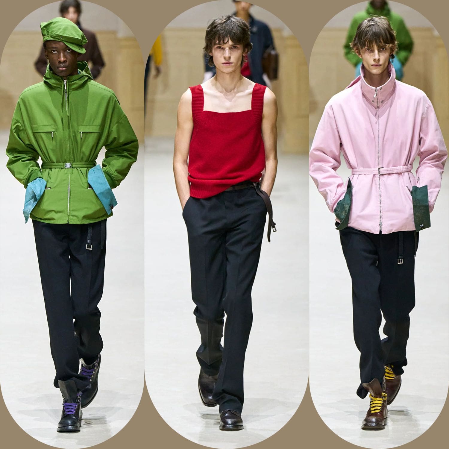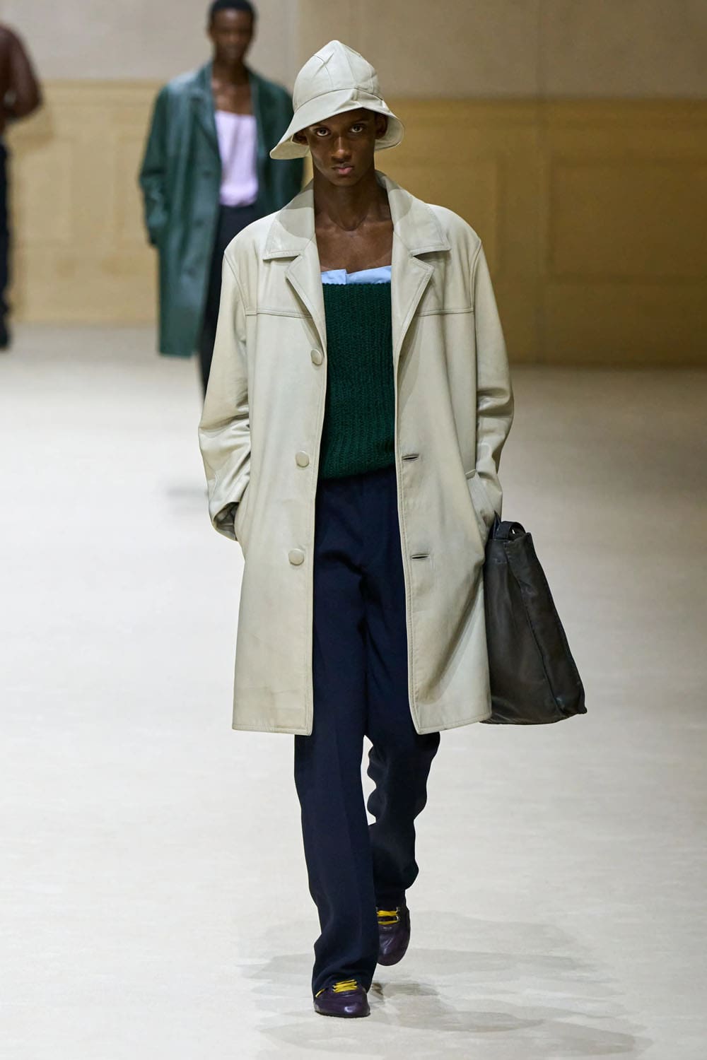 Otra prenda destacada llegó a mitad de camino: una gabardina en rosa apagado, monocromática desde el abrigo hasta el sombrero de pescador. Desprovisto de herrajes, logotipos o incluso contraste, fue un ejemplo del control de Prada. El color se convirtió en estructura. La identidad se destiló en proporción.