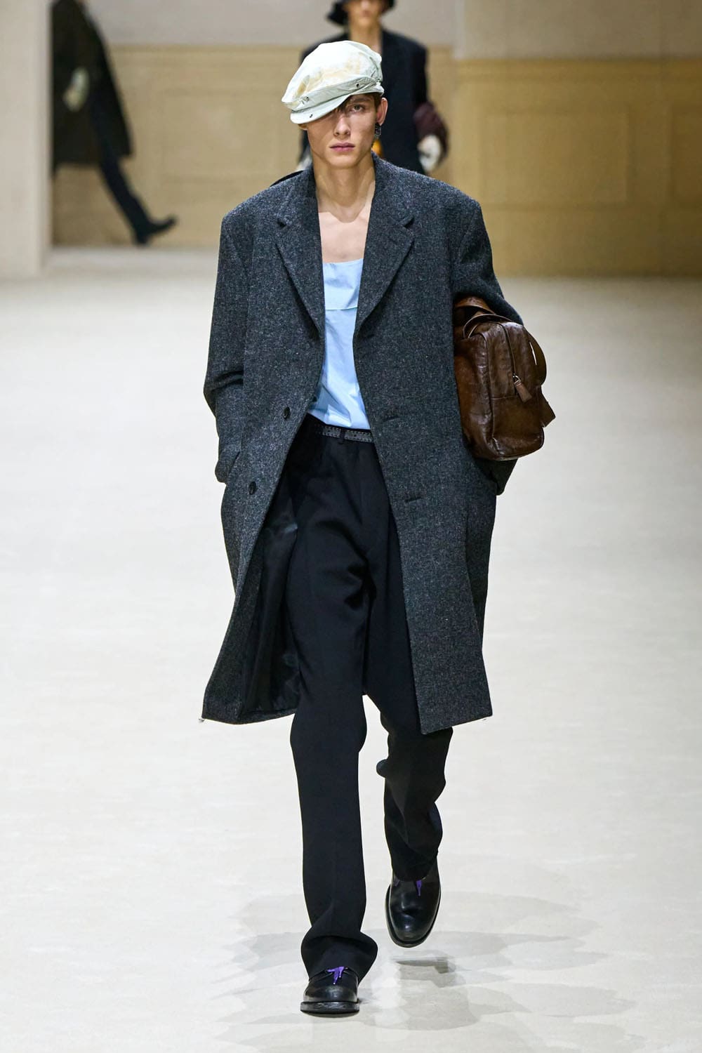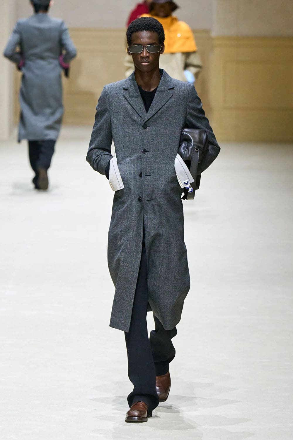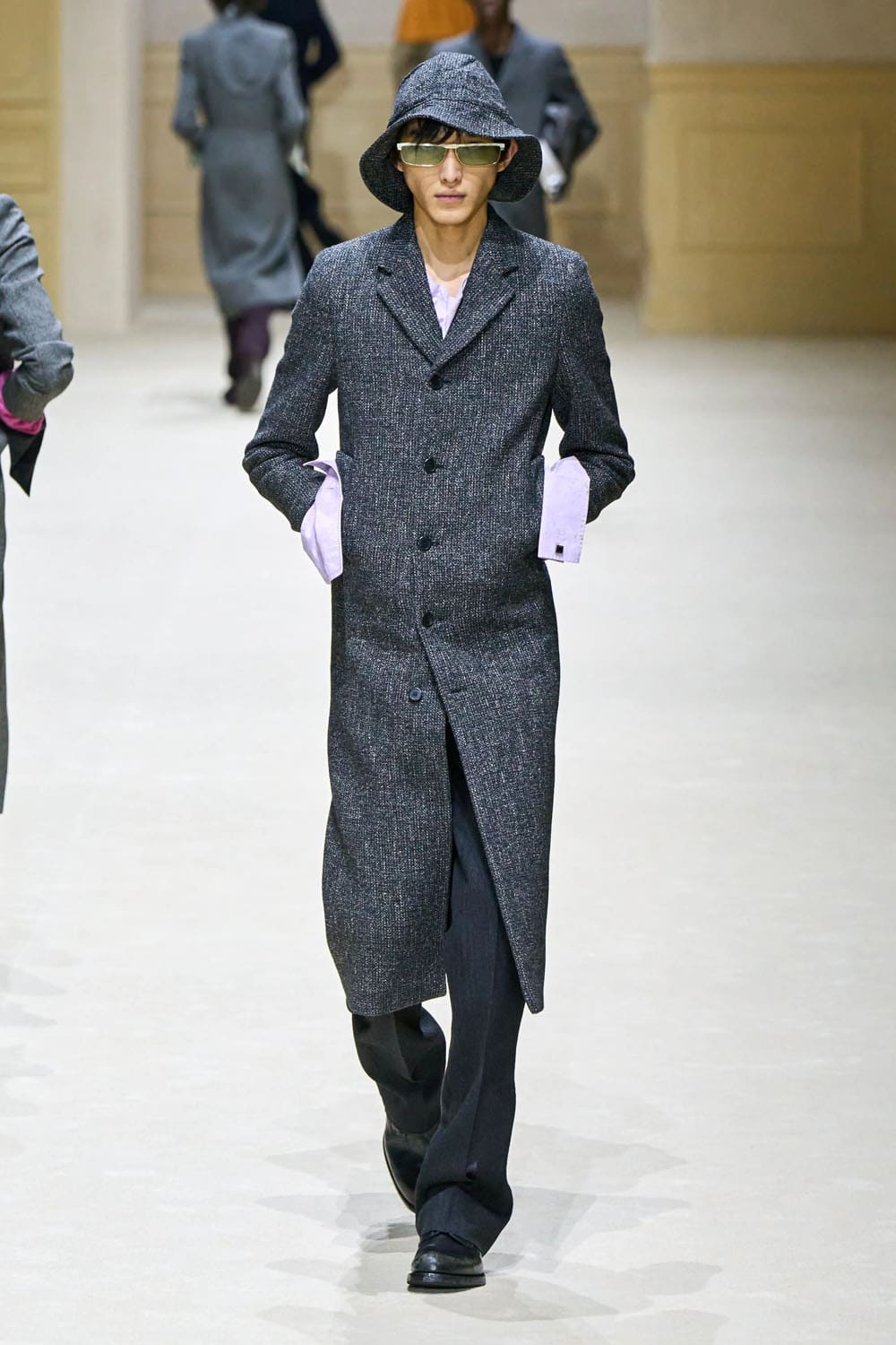 Otra prenda destacada llegó a mitad de camino: una gabardina en rosa apagado, monocromática desde el abrigo hasta el sombrero de pescador. Desprovisto de herrajes, logotipos o incluso contraste, fue un ejemplo del control de Prada. El color se convirtió en estructura. La identidad se destiló en proporción.