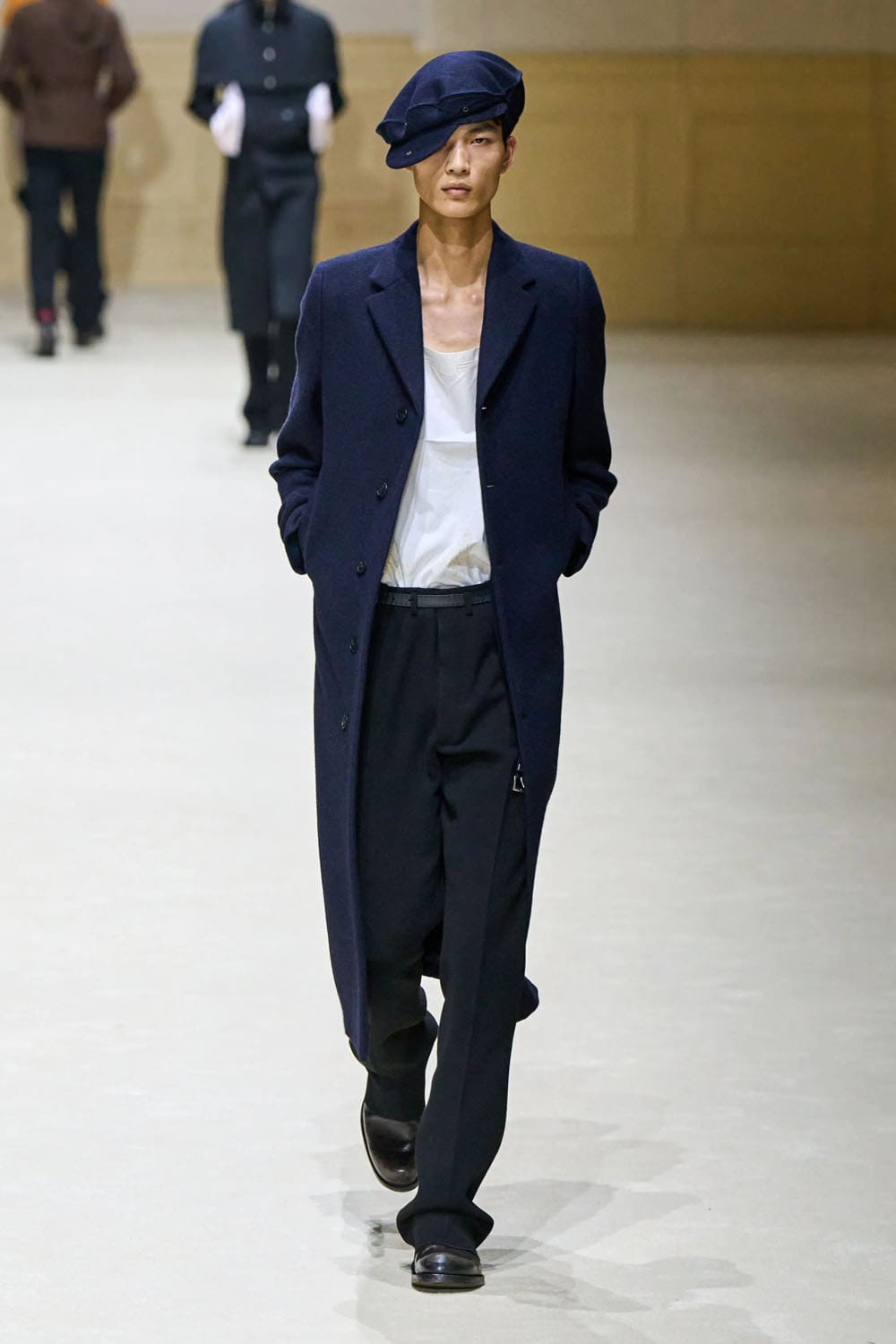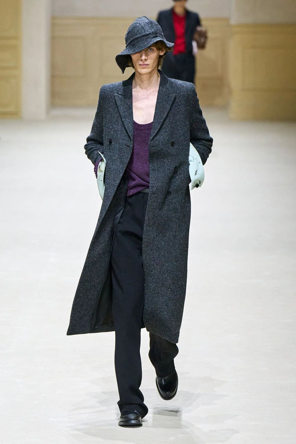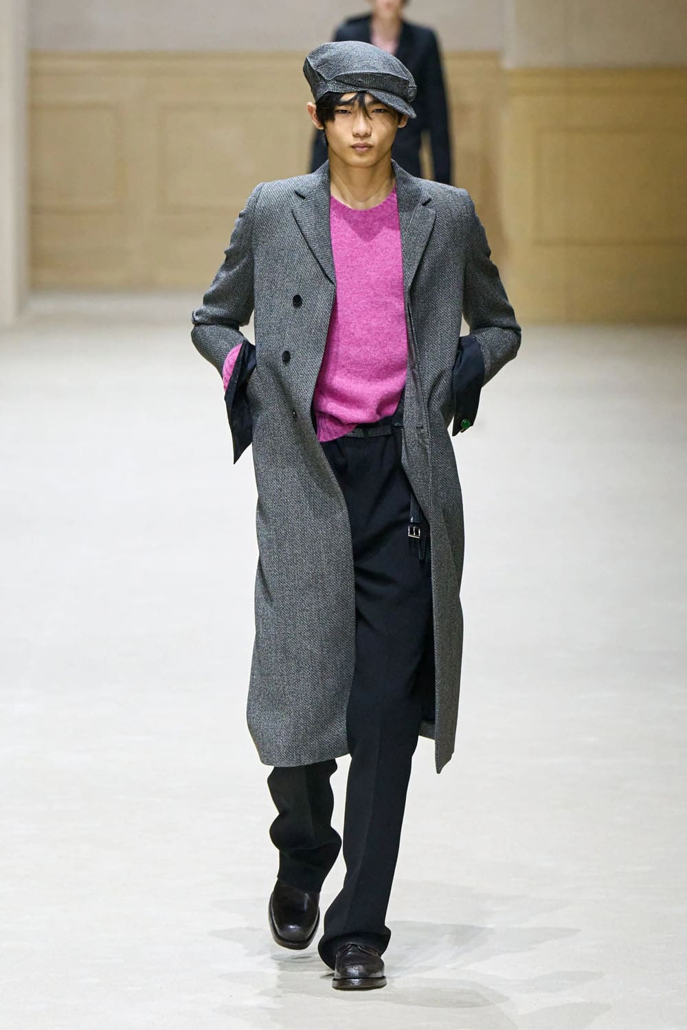 Y entonces, silencio: un último look completamente negro, impecablemente entallado, cruzado, con pantalones anchos y un sombrero de pescador de estructura suave. Pero justo debajo de la manga, un destello de forro rosa. Una resistencia silenciosa. Un susurro de vulnerabilidad en un exterior por lo demás codificado.