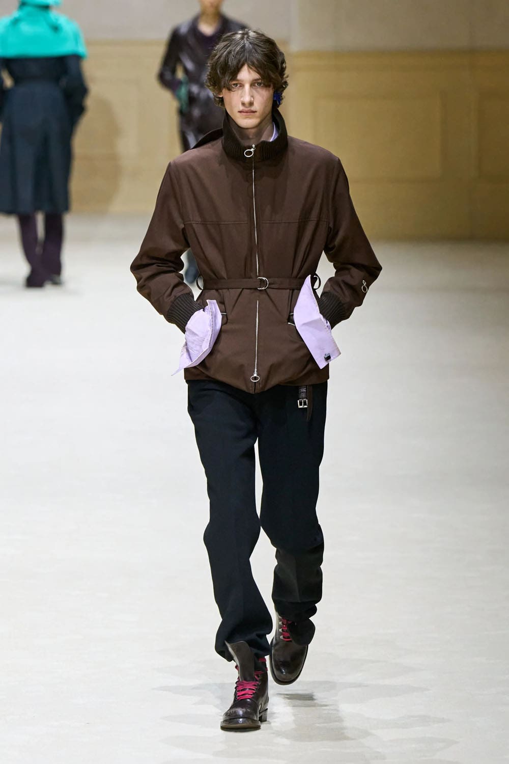 Por otra parte, un abrigo rosa empolvado con cremallera rompió el ciclo de la gabardina: ligeramente más corto, con cremallera alta, ceñido con cinturón y con bolsillos utilitarios verde pino. Al principio parecía sobrio, hasta que los detalles —guantes de cuero, botas de montaña— cambiaron la narrativa hacia una rebelión controlada.